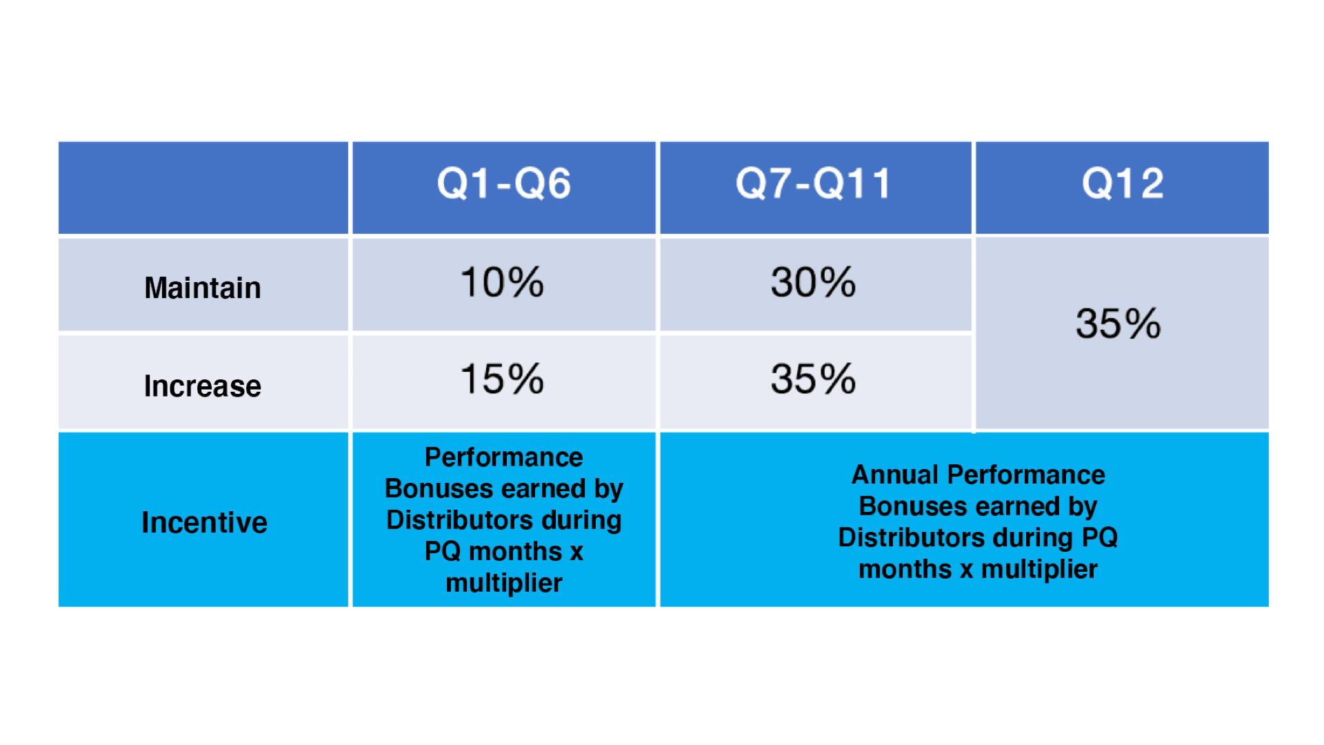 - Qualified Diamond must also be recipients of Diamond Bonus to receive 35% or 45% of Frontline Growth Incentive. Otherwise, only 30% or 40% of Frontline Growth Incentive will be applied.