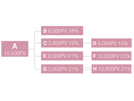 A的紅寶石獎金為 A+B+C = $240,000BV(15,000PV) + $128,000(8,000PV) + $32,000(2,000PV) = $400,000BV