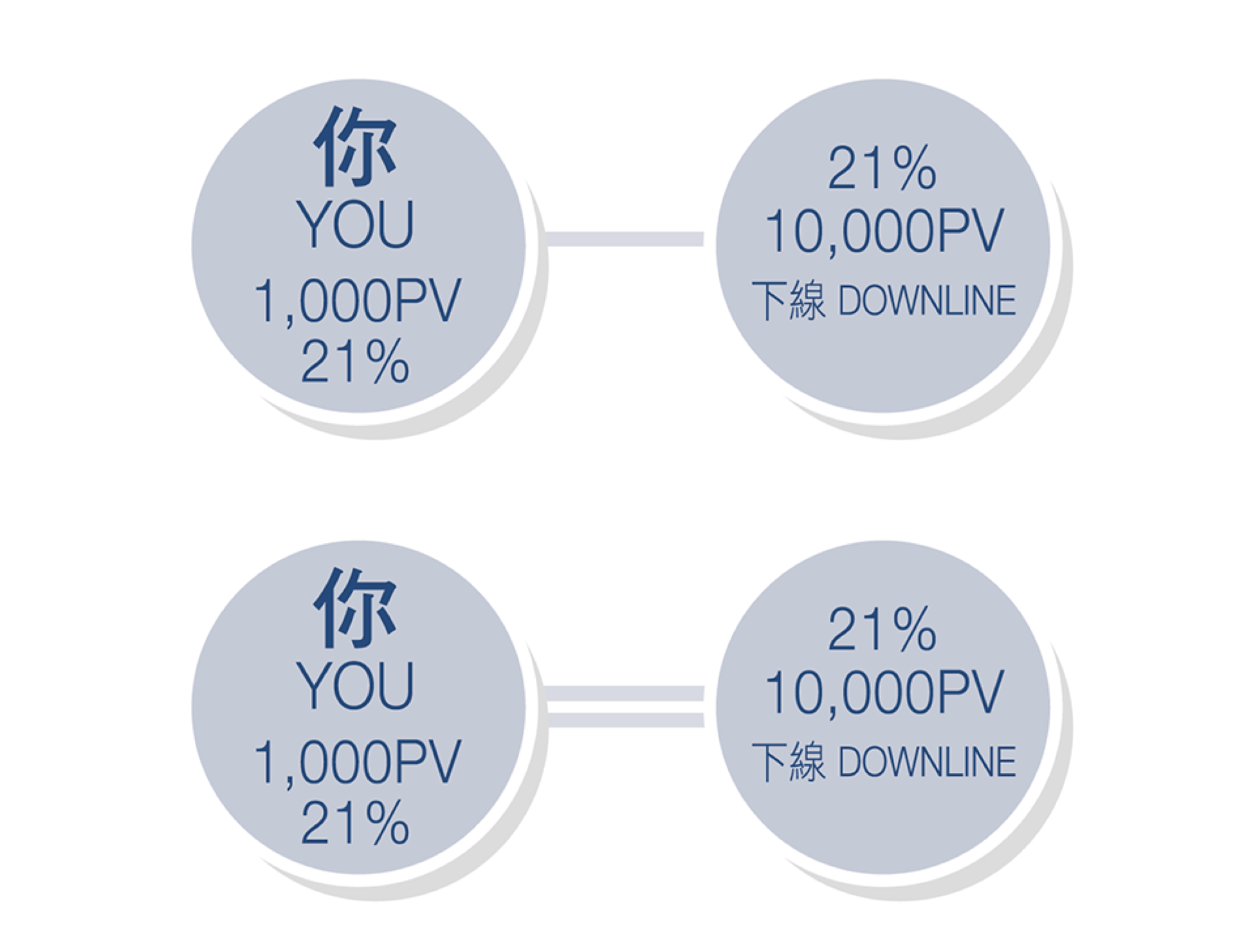 如圖所示,在親自推薦情況下,當下線達到21%月結獎金比率,即10,000PV,你的個人小組積分額雖然只有1,000PV,但也自動享有21%月結獎金比率。在代推薦情況下,當下線達到21%月結獎金比率,即10,000PV時,你亦可自動享有21%月結獎金比率。